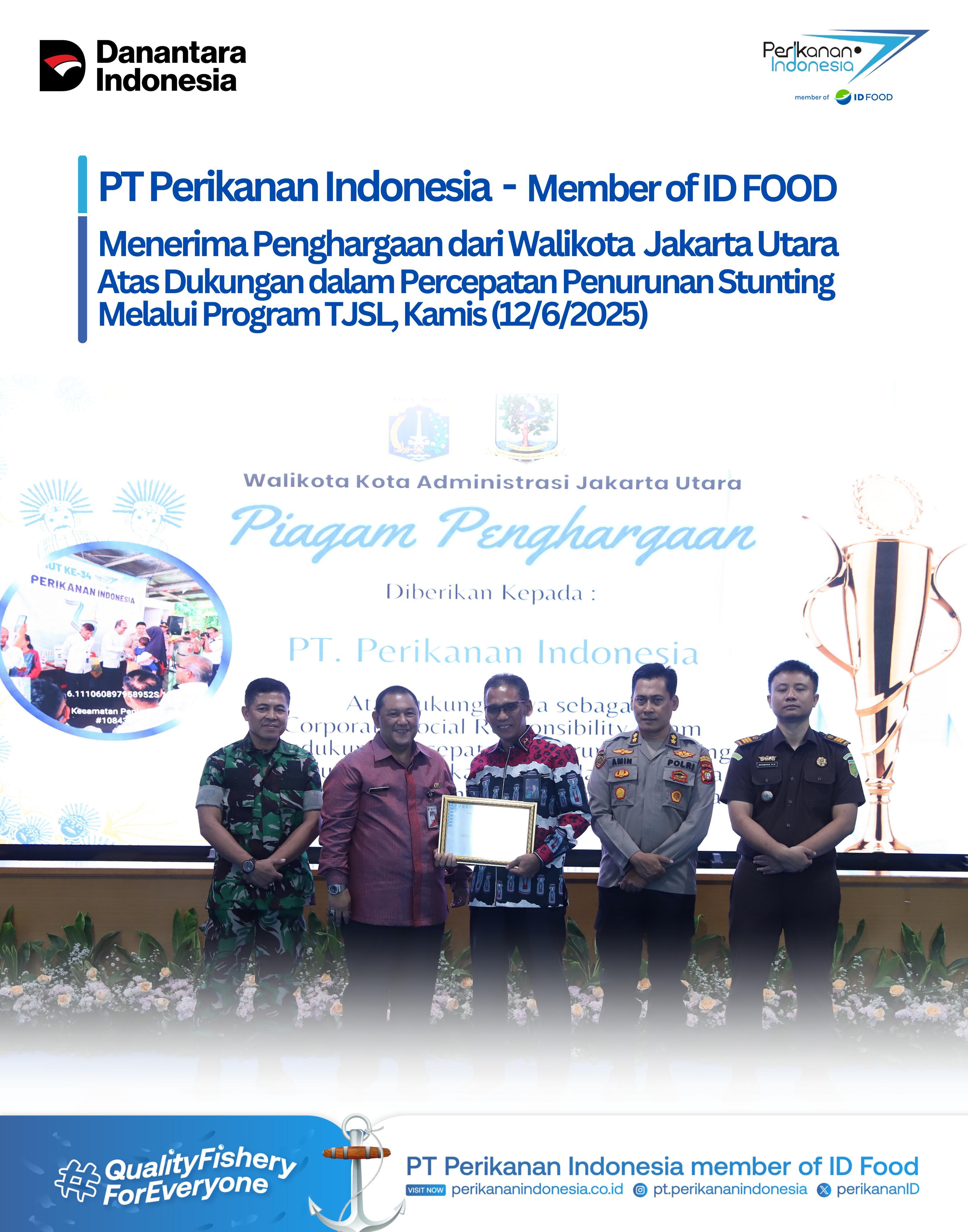 Penghargaan ini terkait dukungan PT Perikanan Indonesia dalam percepatan penurunan stunting di kawasan Jakarta Utara, area operasional perusahaan.