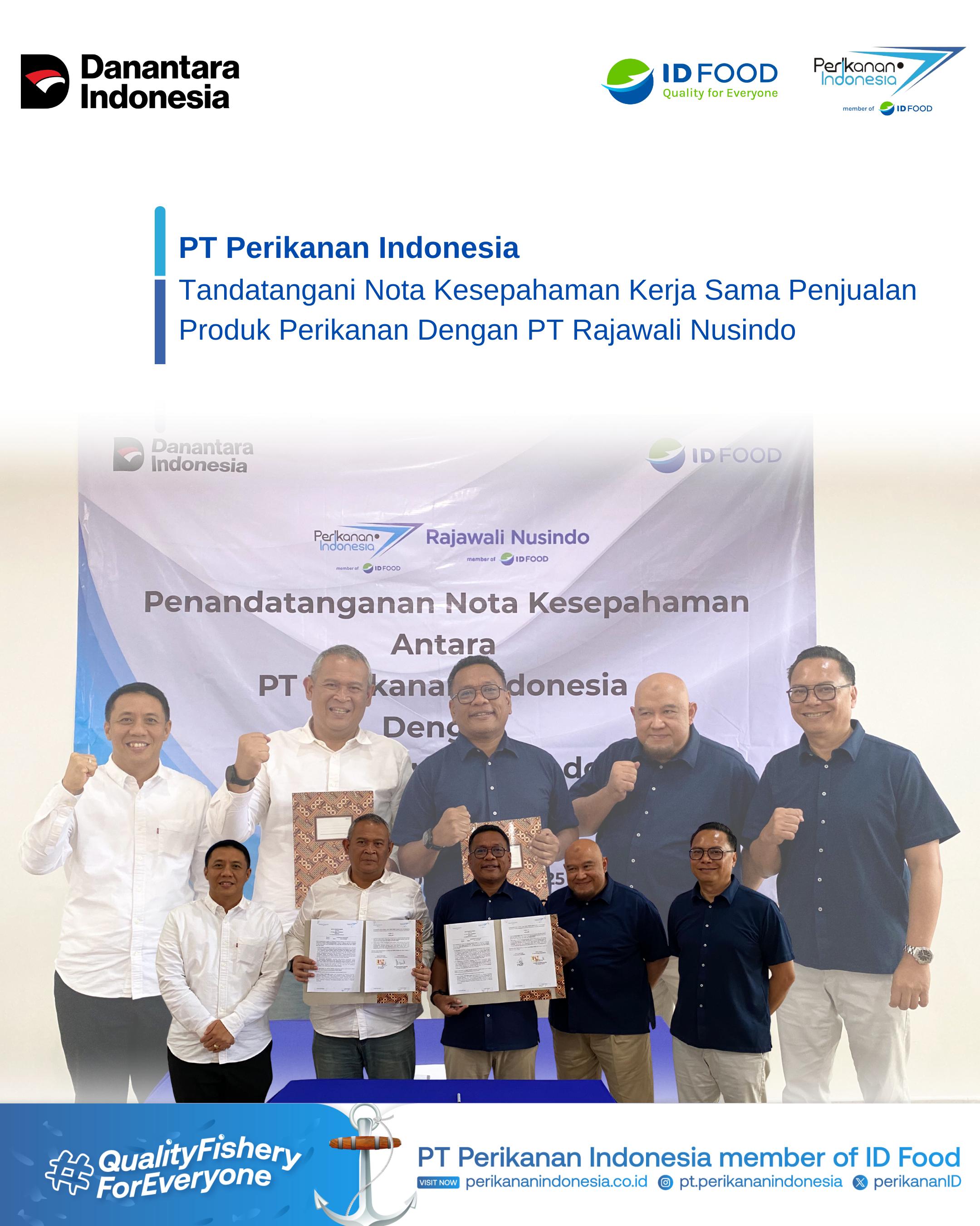 Penandatanganan Nota Kesepahaman (MoU) antara PT Perikanan Indonesia dan PT Rajawali Nusindo secara resmi dilakukan oleh Plt. Direktur Utama PT Perikanan Indonesia, M. Rizali Umarella, bersama Plt. Direktur Utama PT Rajawali Nusindo, Wahyu Sakti. Kerja sama ini terkait penjualan dan pembelian produk perikanan.